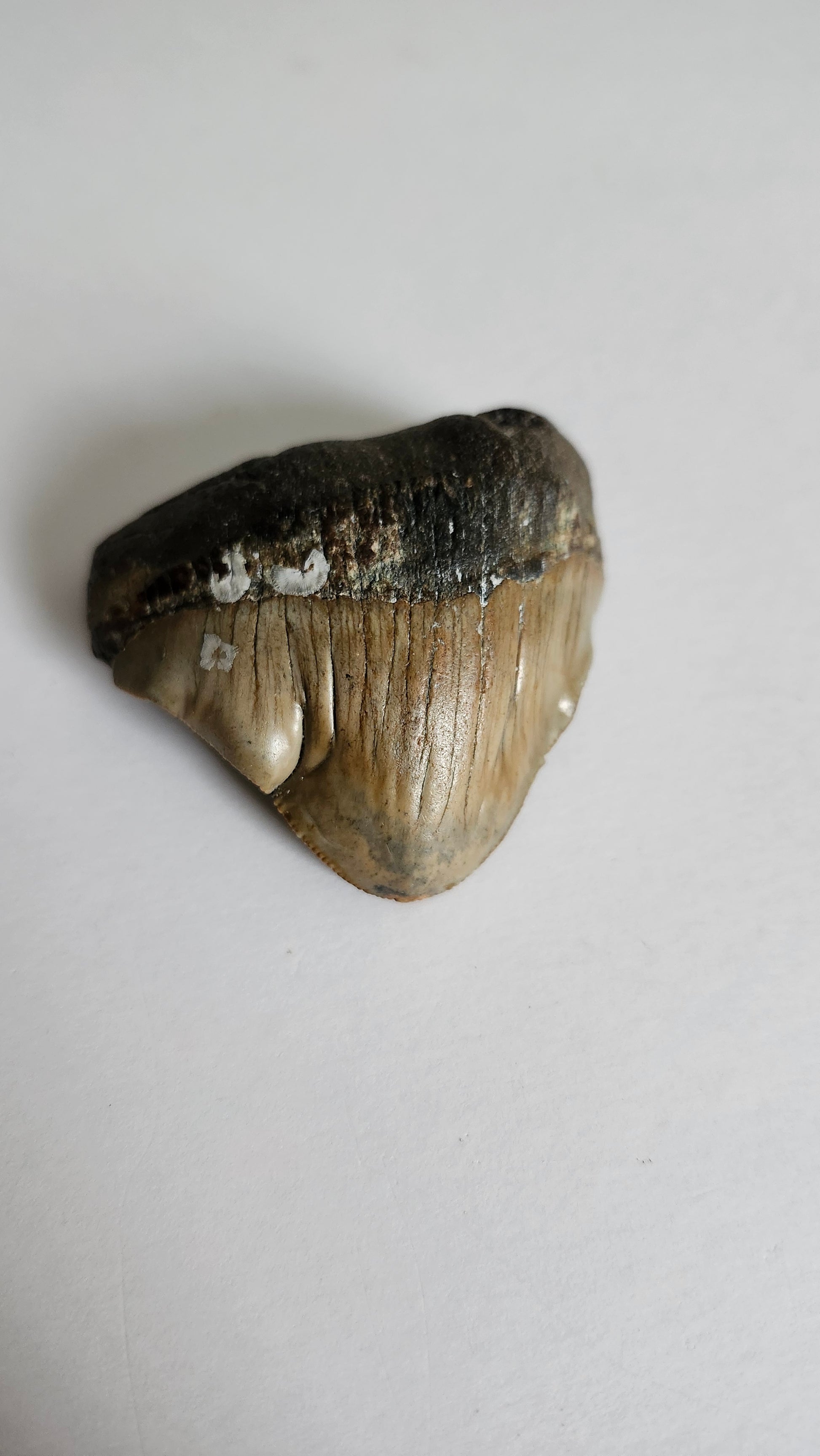 This is a truly one-of-a-kind Megalodon tooth, a rare testament to the life and struggles of this ancient predator. The unique, pathological shape makes it a fascinating and highly collectible piece. This tooth's striking and unusual form tells a story of survival and offers a captivating glimpse into the unpredictable nature of the prehistoric world, making it a must-have for any serious fossil enthusiast. #A20