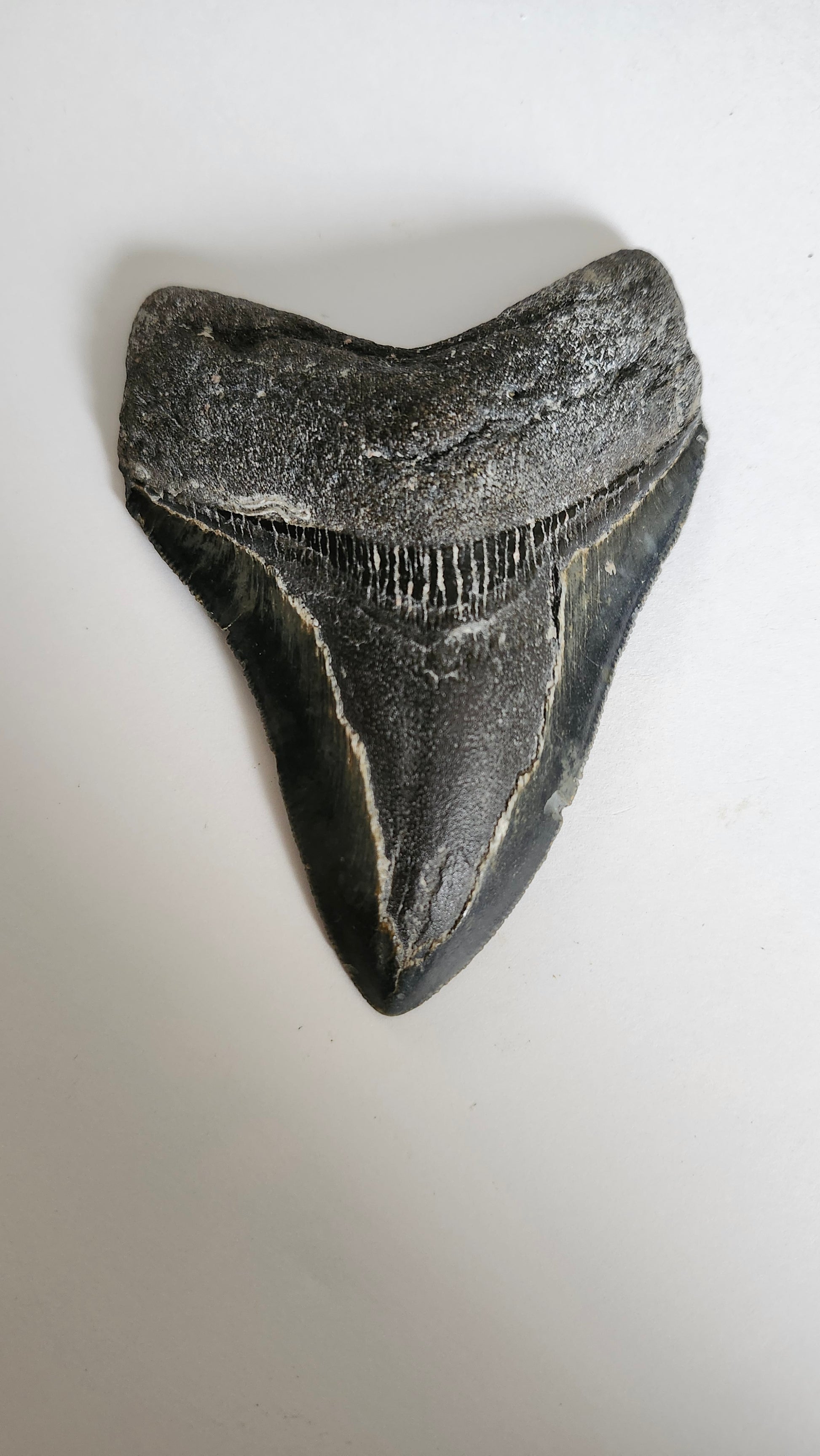This 4.3-inch Megalodon tooth is a striking fossil with a rich history. Its deep black coloration gives it a mysterious and powerful presence. While it shows some age with a missing patch of enamel, its fantastic serrations are perfectly preserved, a testament to the might of the prehistoric shark. This tooth is a great addition to any collection, offering a glimpse into a time when giants ruled the seas. #A13