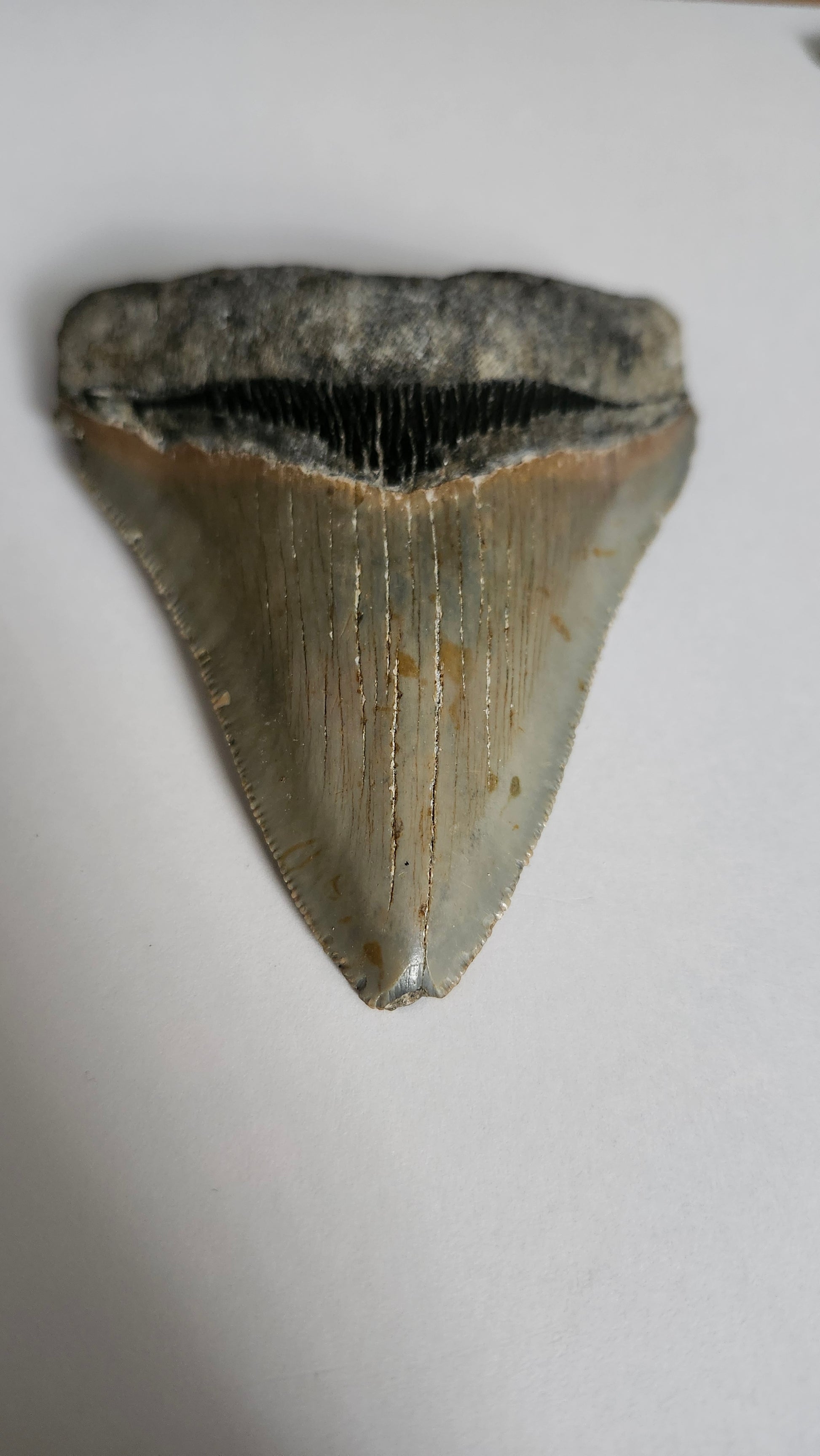 Discover a piece of the past with this impressive 4.5" Megalodon tooth. Featuring nearly perfect, razor-sharp serrations, this fossil is a testament to the power of the prehistoric apex predator. While a small ding in the tip tells a story of its long history, it remains a beautiful and high-quality specimen, perfect for any collector. #A10