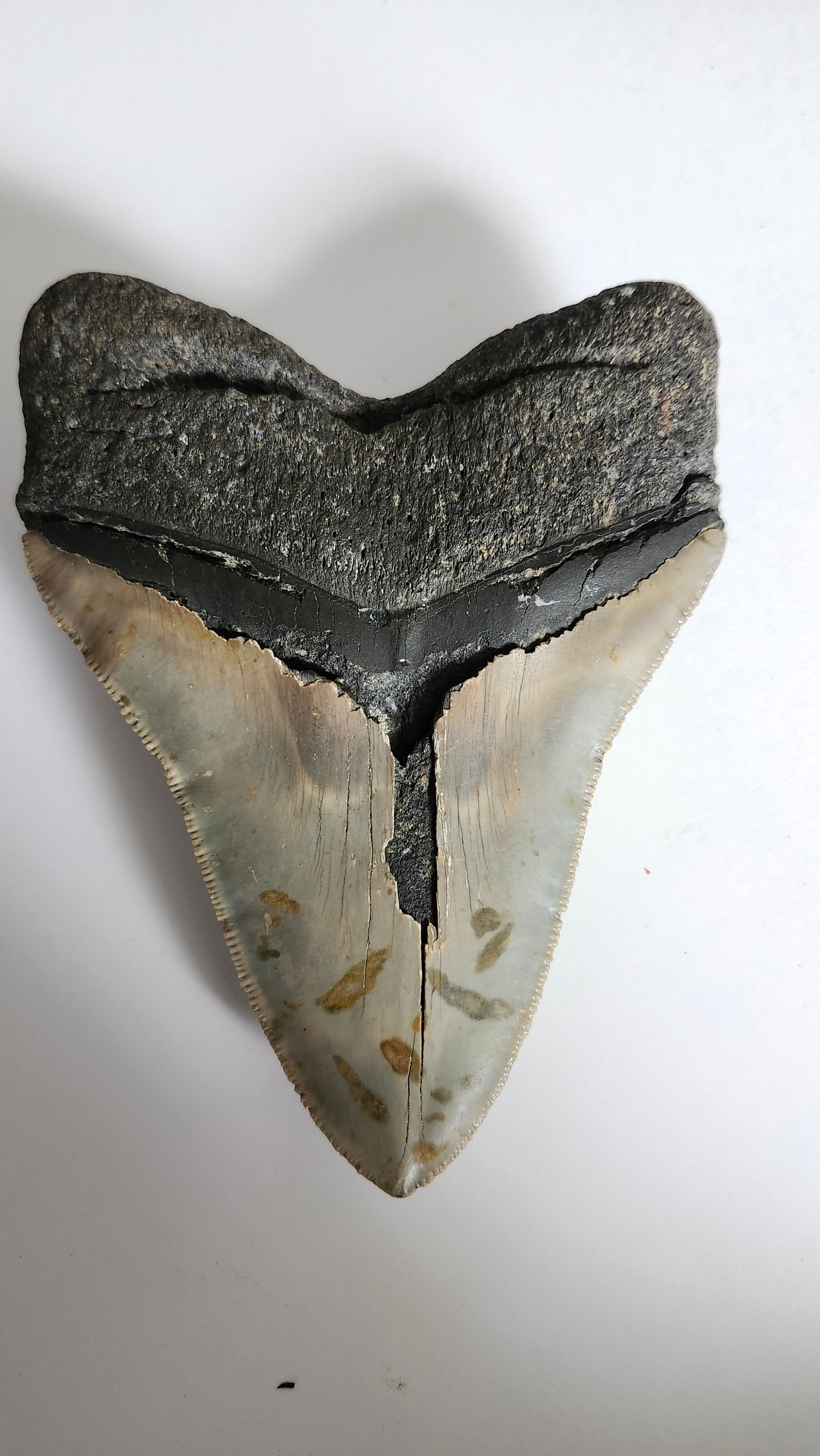 This magnificent 5.2-inch Megalodon tooth is a true showstopper. The intricate blend of black, gray, and subtle bluish coloration creates a stunning visual appeal. Its serrations are in perfect, razor-sharp condition, showcasing the power of this ancient predator. While there is a minor enamel peel, it does not diminish the overall beauty and impressive size of this fossil. It’s a remarkable piece for any collection, embodying the grandeur of the Megalodon. #A14