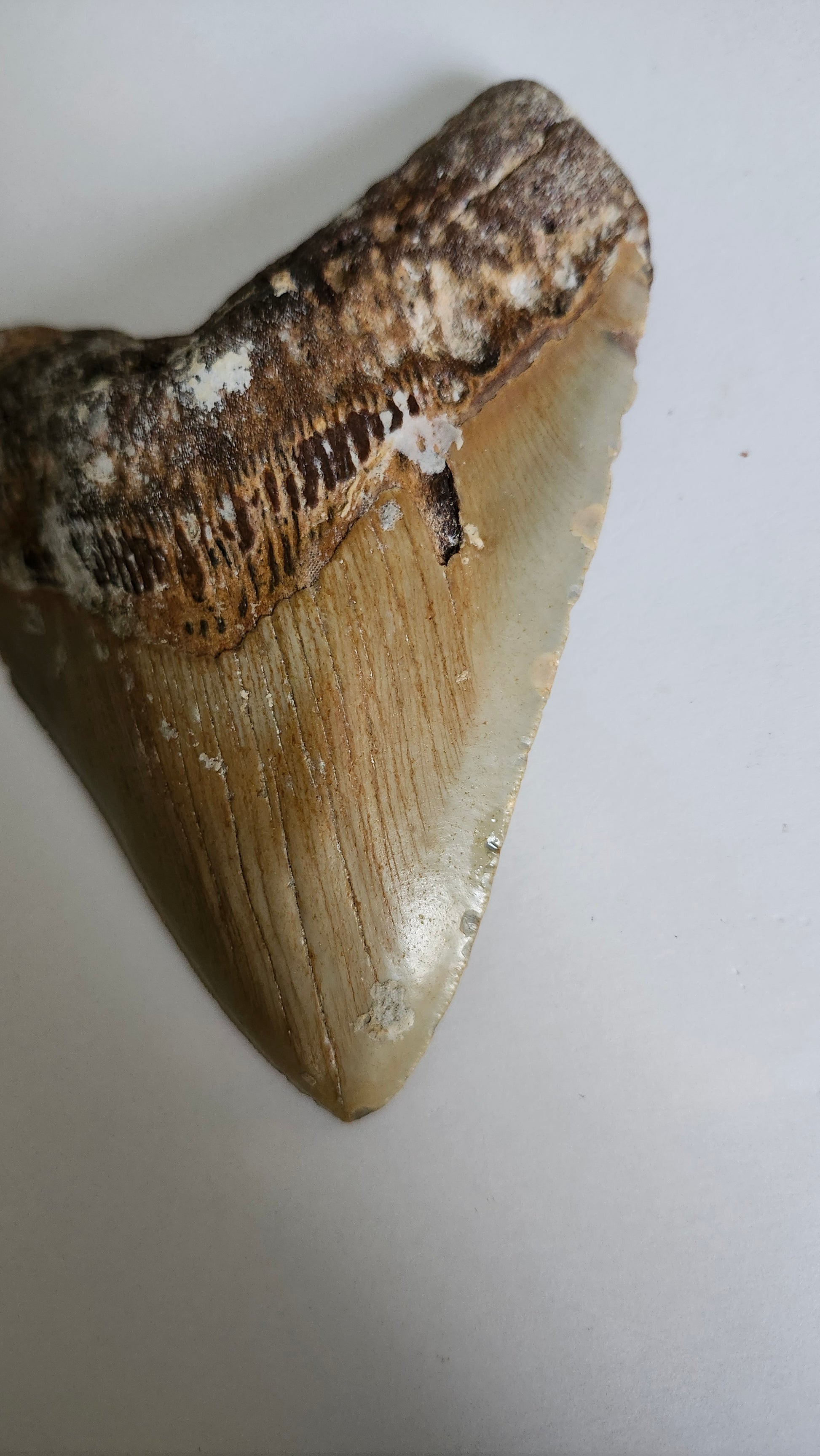 This stunning Megalodon tooth measures an impressive 5.2 inches, showcasing beautiful golden coloration that gives it a warm, striking appearance. While it has some minor imperfections, they are a testament to its age and journey through millions of years of history. This is a remarkable piece for any collection, embodying the grandeur of the Megalodon and the timeless beauty of the earth. #A21