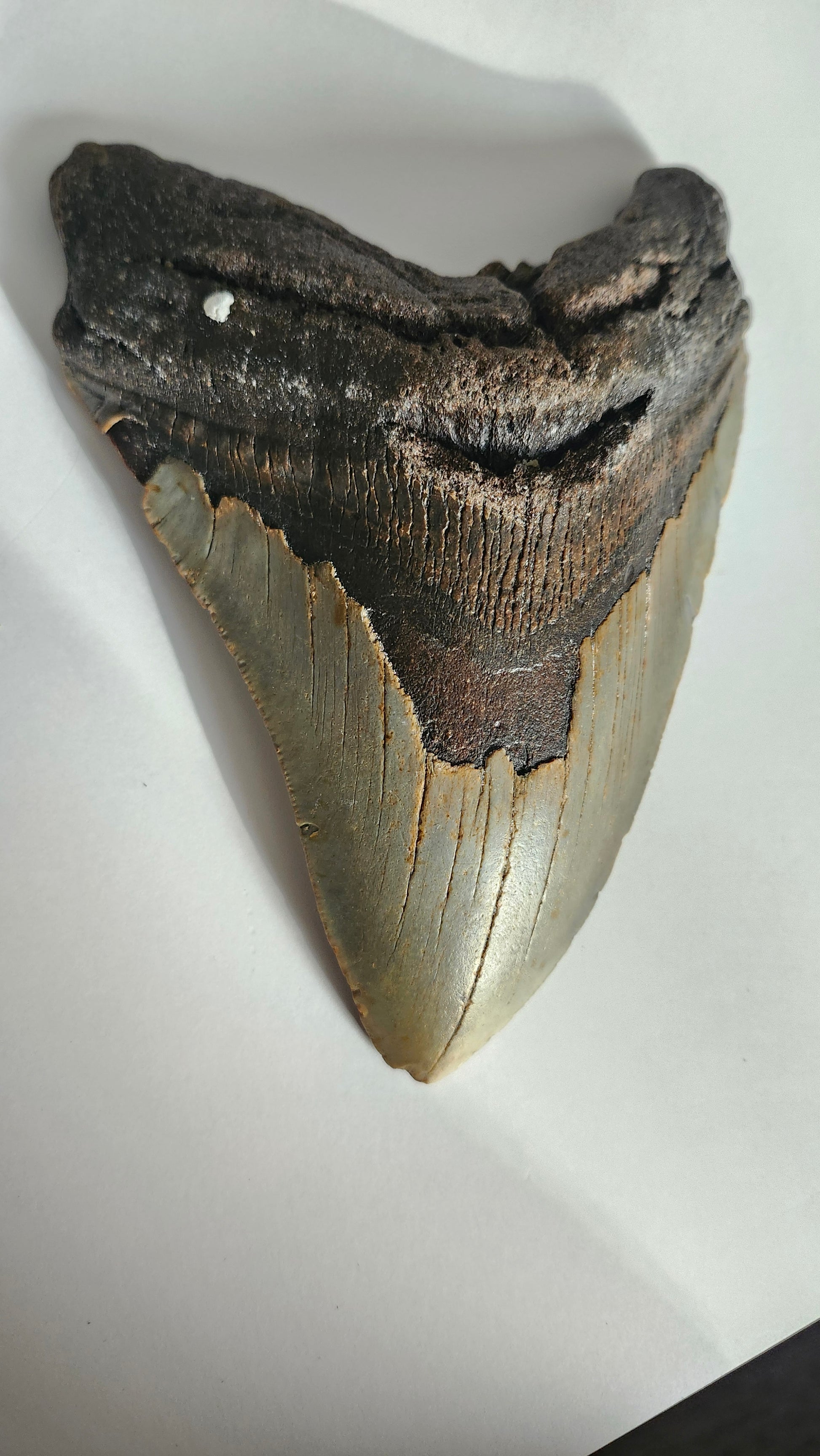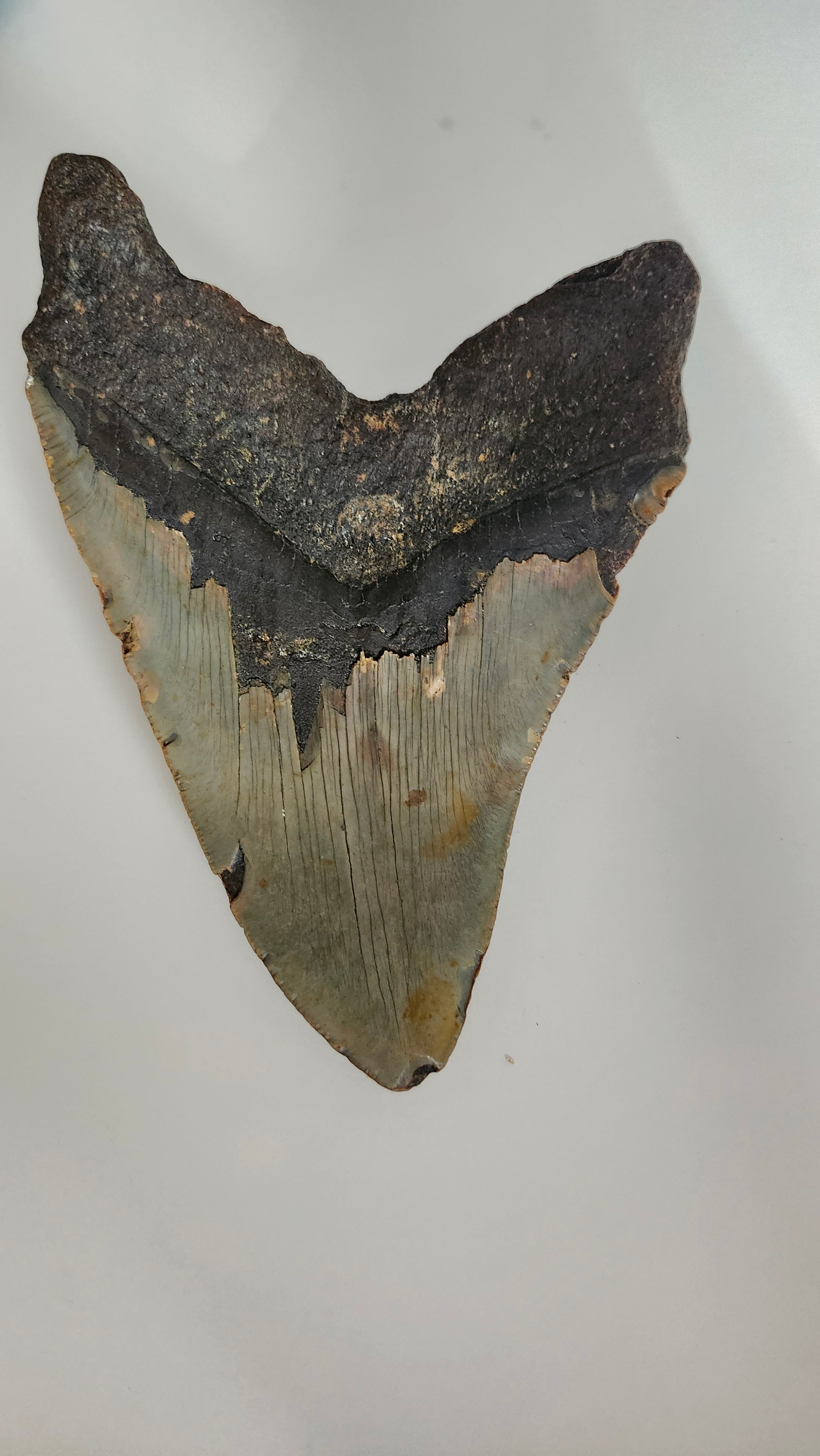 Own a genuine relic from the prehistoric seas with this impressive 6.3-inch Megalodon tooth. While it shows some signs of its millions-of-years-long journey, this tooth boasts a captivating array of colors that make it a truly unique and beautiful piece of natural history. Its rugged charm and vibrant hues are perfect for the collector who appreciates the authentic story behind a fossil. #A11