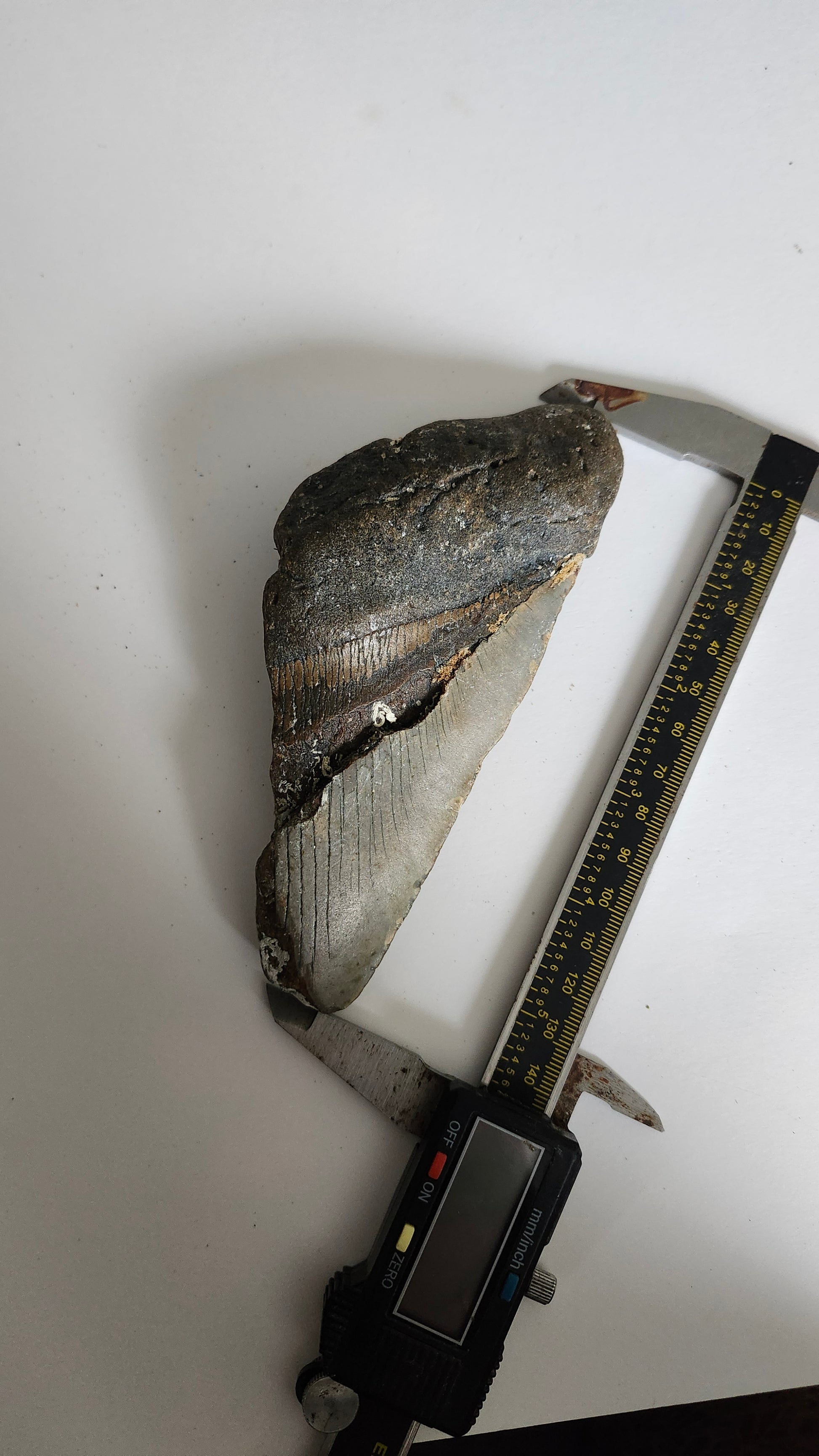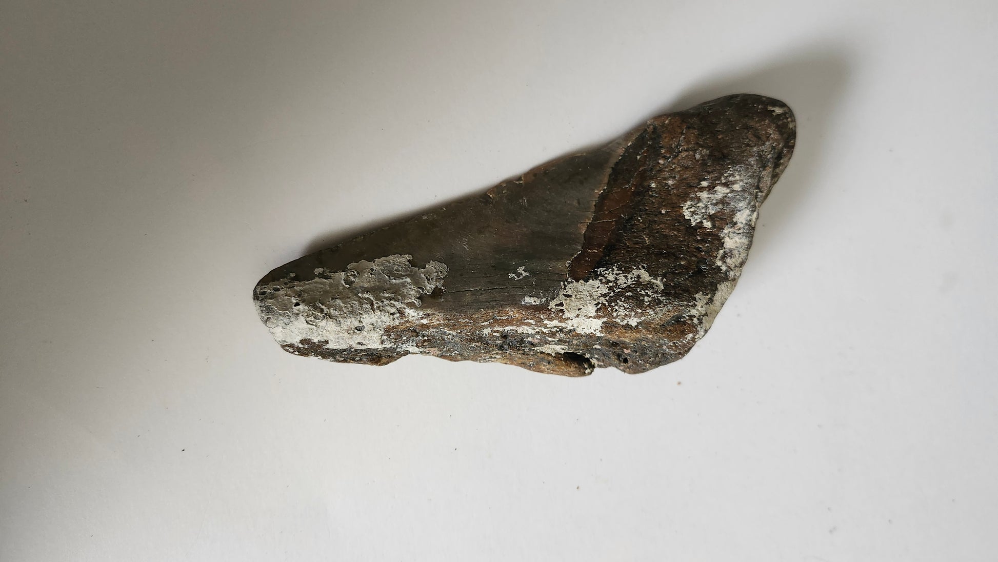 While it may not be whole, this genuine Megalodon tooth is a powerful relic of the past. The jagged edges and worn surfaces tell a story of ancient battles and the immense power of the ocean's greatest predator. It's a tangible piece of prehistoric history, perfect for display or as a unique addition to any fossil collection. #A18